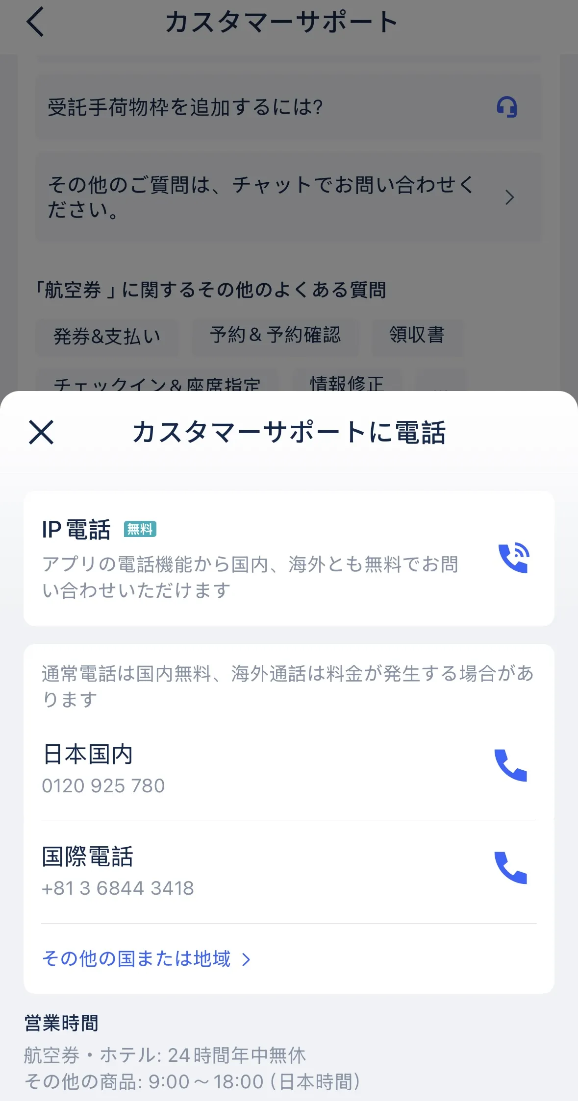 電話でのカスタマーサポートを選んだ場合は、無料のIP通話や国内通話、有料の国際通話がご利用いただけます。