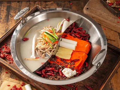 重慶といえば火鍋!しかし、本場の火鍋は非常に辛いため、辛さが苦手な方には「鸳鸯鍋(ユアンヤン鍋)」がおすすめです。赤い麻辣スープと白い清湯スープが一緒に提供されるので、好みに合わせて楽しめます。最近では、一人用の鍋を提供するチェーン店も増えており、一人旅の方や観光客でも気軽に火鍋を楽しむことができます。