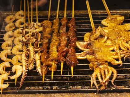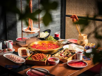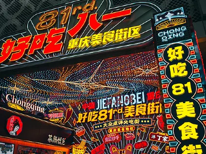 重慶グルメを気軽に楽しめるフードストリート。火鍋はもちろん、小麺や焼き魚などローカル料理が並び、辛さの奥深い魅力を味わえます。
