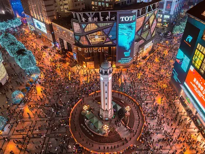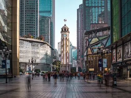 重慶の中心にあるショッピング&グルメエリア。日本の渋谷や新宿のような賑わいで、地元の若者文化に触れられます。夜はネオン輝く夜景が魅力。屋上カフェから市街地を見渡すのもおすすめです。