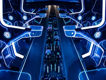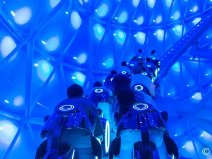 光るバイクに乗って未来都市を疾走する、世界最速級のコースター。スピード感と演出が圧巻で、上海限定の大人気アトラクション。
