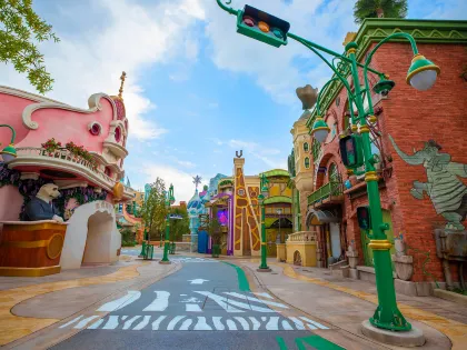 映画『ズートピア』の世界を体験できる上海限定ライド。ジュディとニックと一緒に街を駆け抜けるスリリングな追跡アトラクション。子どもにも大人気。