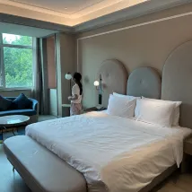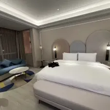 部屋は広々としていて、サービスも丁寧でした。朝食は遅く起きてしまい、あまり食べられませんでしたが、急いで取りに来られることなく、ワンタンなどの料理も用意してくださりました。到着時に用意されたフルーツもたっぷりで、寝具も快適で、設備やアメニティも全て機能的でした。ユニバーサルスタジオまで4~5kmほどなので、タクシーでの移動も便利です。近くにある紫光園ヨーグルトと味噌麺のテイクアウトもとても便利で、ホテルの近くには美味しいバーベキュー店もあります。