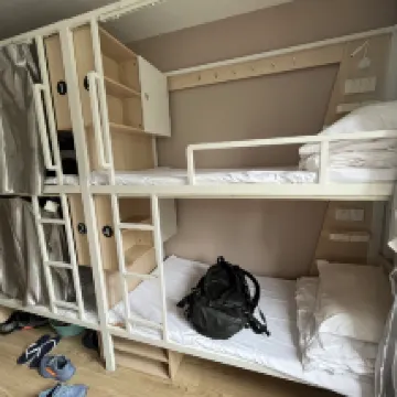 北京 - 4人用ドミトリーに3泊しました。 期待/現実: 最大の問題は、上段のベッドに関する設計上の欠陥です。カーテンが天井に当たらないため、共用スペースの光から保護されません。誰かが遅れて部屋に入ってくると、迷惑になります。また、ベッドはかなり硬いため、マットレスに慣れている人には快適ではないかもしれません。 セキュリティ: かなり良好で、ドアコードがあり、ゲストごとに大きなロッカーがあり、ベッド自体に小さなロッカーがあります。問題はありません。 衛生: 悪くありません。バスルームとシャワーは4人で共有します。一部のゲストは部屋で喫煙しても罰せられず、非喫煙者にとっては迷惑です。全体的にかなり清潔です。 ホスピタリティ: 係員は親切で、チェックインはスムーズでした。問題はありません。 社交的な雰囲気: 社交エリアはかなり良好です。軽い運動に最適な小さなジムルーム、素晴らしい屋上テラス、シアタールームもあります。 全体的に: 素晴らしいロケーション、789 に近く、価格も手頃。運よく下段のベッドと思いやりのあるルームメイトに恵まれれば、最高です。