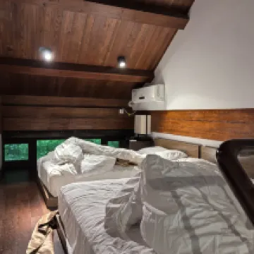 夜10時前に車から荷物を取りに行きました。外は真っ暗で雨が降っていました。懐中電灯を使ってフロントに街灯がない理由を尋ねたところ、9時半に消灯したとのこと。それ以降は外出禁止とでも言ったのでしょうか? ロフトの部屋を予約したのですが、エアコンがひどく故障していました。どんなに強く回しても風がベッドに吹き付けてきて、翌日子供たちは風邪をひいてしまいました! 朝食どころか、料理のネームプレートすらありませんでした!量もひどく少なかったです!