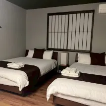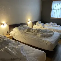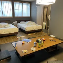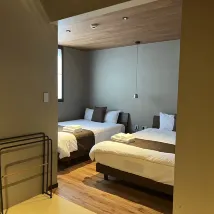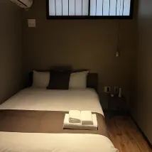 セミダブル3台の部屋に大人5人で泊まりました。リビングは広くて、畳の上で座椅子に座りながら全員くつろげる空間です!目の前にスーパーがあるので、お菓子やお酒を買って、部屋でゆっくりできるのがよかったです。 たまごボーロが少し落ちてたのでそこだけ気になりましたが他は綺麗で過ごしやすい宿です。また、無人チェックインなので、到着時間を気にしなくていいのも楽ちんでした!