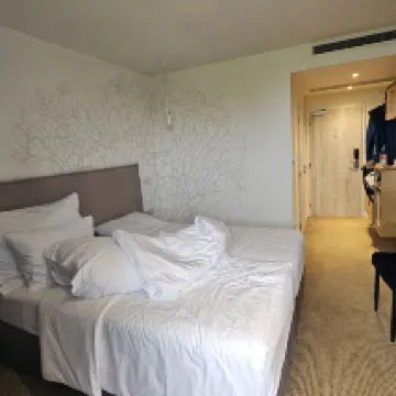 Located next to the lake, the city centre is a bit far away (15 min by car). The hotel has a free parking but it’s not really big. The room was clean and the wellness is good, but it can get very crowded and you have to wait for the jacuzzi (e.g.) or no place to sit or relax. The hotel offers a buffet breakfast that is really good but there are times when it’s reaalllly busy and they run out of stuff and also bit difficult for people with gluten intolerance/ coeliac. The hotel staff is really kind and they speak good English.