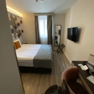 このホテルは本当に素晴らしかったです!空港からは100E番のバスで一駅先のKalvin ter(2500フォリント)まで行き、そこから歩いて数百メートルです。立地は最高です。部屋は小さめでしたが、一人で泊まるには十分な広さでした。ベッドサイドのコンセントも便利で、シャワーの水温と水圧も十分でした。廊下の防音は少し物足りなかったものの、窓の外は驚くほど静かでした。ブダペストでの3回の滞在の中で、最も満足のいく滞在でした。