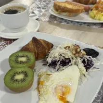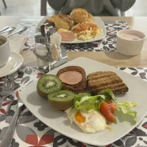 酒店位於半山腰,拖着行李箱徒步上去真是對體力不小的挑戰。房間設施比較簡單古樸,有廚房冰箱餐具可以簡單烹製些食物。衞生間有暖氣片好評,洗的衣服一夜就幹了。從窗口看出去視野較好,五樓有天台,看起來是個封閉的吸煙室。早餐還算豐盛,不過我們用餐當天好多小朋友,有些吵鬧。雖然事先問了前台説沒有接送機服務,但退房後前台還是安排了輛車把我們送到大巴站,付了10歐,意外的服務還挺驚喜。