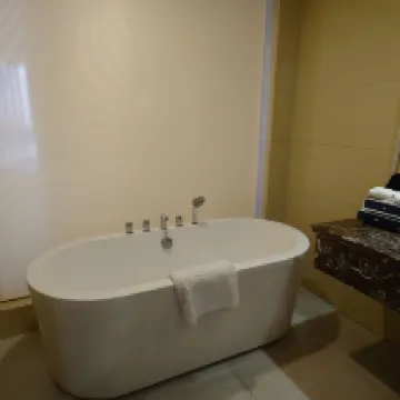 このホテルの第一印象は外観が非常に大きい。部屋の備品は1通り揃っています。そして、大きなバスタブがあります。ホテル到着早々プールに向かいました。下見としてプールとスポーツジムを見学させていただきました。プールを使用しようと受付に申し込みをしタオルの借用を依頼しましたが、室内のタオルを利用してほしいということです。タオルはルームサービスに頼めばいいのですが、一般的なホテルのスポーツジムでの使用タオルは通常貸出が普通。結局、部屋との往復となることでプールの使用は止めてしまいました。 使用した部屋は大きな部屋でしたが、室内の音に関しては問題があります。まず、床のフローリングですが、フローリングと床の間に隙間があり、歩くたびに音が発生。隣の人のいびきも聞こえます。また、ホテル正面の部屋でホテル玄関から約100m以上離れた道路の自動車の走行音が部屋の中に入ってくるのも困ります。1番困った事はKARAOKEの音がそのまま屋内に入ってきて眠ることができなかった。この音は0時30分後まで続きました。朝、室内から下を見るとKARAOKE店が見えます。ホテル側がなぜこの部屋を指定したのか私は分かりませんが、従来であれば静かな部屋を用意頂く配慮が欲しい。このようにKARAOKEの近くやボイラー施設の近く等は客室には不向き。室内の大きなバスタブですが、掃除がされていません。バスタブの内面を指で擦ると白い粉が付着します。これは湯垢です。これは自分で掃除し、使用せざるを得ません。音とバスタブ共に時間も遅くホテル側に部屋の変更を要求しませんでしたが不満が残ります。朝の朝食に関しては客の人数も影響すると思いますが、品数少なく金額としては他のホテルと比較し金額は高いと感じます。 このホテルは五つ星のホテルですが、ホテル側の五つ星の基準と、お客様が感じる五つ星の基準とは差があると感じられるホテルです。お客様の要求として、星の数は関係ありません。いかに快適にそのホテルに宿泊できたかが重要になります。
