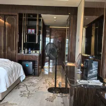 那麼大的酒店,我們住22層,一出電梯走廊就有一股很臭的味道,想着房間估計好一點,房間也一股臭味,像死老鼠味,後來發現旁邊還是弱電間,房間凸出來的地方以為是衣櫃,原來連着弱電間,房間都沒40平,幾百塊錢還不如一百多的,早餐種類少還有個發黴的,可怕