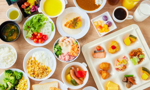 ホテルシュランザ CHIBAにお泊まりのお客様は、沖縄料理 きじむなぁの家で食事を楽しめます。朝食ビュッフェを毎日 6:30 ~ 9:00 までお召し上がりいただけます (有料)。