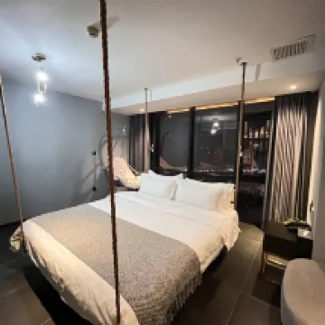 ホテルは解放碑エリアにあり、移動にとても便利です。270度広がる窓からは、朝天門や両江合流の景色が一望でき、開放感抜群です。特筆すべきは、部屋にあるハンモックとロッキングチェアです。そこで揺られながら川の景色を眺めるのは、快適で心地よい時間でした!また、バスタブだけでなく、部屋にはサウナまで完備されており、汗を流してリフレッシュでき、全身がリラックスできました。