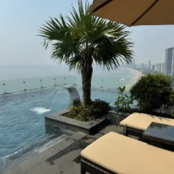 屋上にプールがあり、目の前に海が見えるのでとても映えました。お部屋も広くて、まぁまぁ綺麗でした。受付にいるスタッフの方が丁寧でした。朝ごはんはフルーツやベトナム料理があり味は普通です!