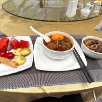 ホテル周辺にはショッピングモールや多くのレストランがあります。古都の直線に非常に近く、上層階からは塔や城壁を直接見ることができます。しかし、徒歩や自転車では他の城門まで迂回する必要があり、まっすぐ歩いて向かう城門は開いていません。ホテルの部屋は十分なスペースがありますが、目視で確認すると45平方メートル未満で、1.35のダブルベッドが2台あり、非常に快適です。フロアのサービススタッフはとても熱心で、率先して掃除をしてくれます。部屋の防音効果は若干不足します。初日には部屋に果物が与えられました。朝食は、特製のスライスヌードルとハギスがあり、味はまあまあです。