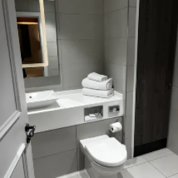 Nice, modern hotel in a great location. The bed was super comfy and a good size. Has a little kitchenette so basically has everything you would need. The bathroom was large and shower was good.