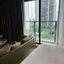 帶小孩出來玩隨便就訂了這間,幸好沒有失望,房間裝修簡約時尚,有落地窗玻璃門光線視線都很好,樓層高還可以看到一點江景。每天都會有阿姨打掃衞生,小孩子把房間搞得很亂吃東西掉了一地,阿姨態度很好衞生做得也乾淨。看有小孩還多給了兩瓶水,真貼心。體驗非常滿意!