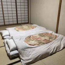 ホテルの立地は最高でした。大涌谷行きのバス停がホテルのすぐ目の前にあるんです。ただ、雪がなかったので、外の景色は特に見るべきものがありませんでした。山と枯れ木ばかりで。食事なしのプランを選んだので、チェックイン時にはすでに2組の布団が敷かれていました。