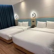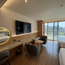 寝具がとても快適で、部屋も広々としており、テラスもありました。フロントスタッフは英語対応可能でしたが、中国語は通じませんでした。特に親切な女性スタッフがおり、タクシーの手配なども助けてくれて、大変助かりました。ホテル周辺にはCUコンビニやBHCチキンがあり、BHCチキンには中国語を話せるスタッフもいて便利でした。