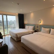 部屋は広々としていて、小さなテラスもあります!友達との旅行でしたが、毎日部屋を綺麗に掃除してくれてとても助かりました。フロントのスタッフもとても親切でした。空港へ向かう際、もしタクシーがなかなか捕まらないようなら、早めにフロントでスタッフの方に手配をお願いすると良いですよ。乗り遅れないように!乙旺里海水浴場からも近く、100mほど坂を下るとすぐにコンビニがあって便利です!