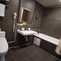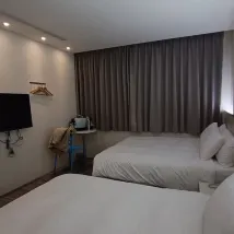 ホテルのフロントデスクのスタッフは非常に優秀で、礼儀正しく、親切でした。ホテルの近くに無料駐車場があります。また、ホテルのロビーにはビスケット、アイスクリーム、蒸しパン、コーヒー、紅茶、オレンジジュースなどを提供する24時間営業のスナックバーがあります。 ホテルではシンプルな朝食を提供していますが、美味しいです 4人部屋にダブルベッドを2台置いたら、スペースはあまり広くなく、丸いテーブルと椅子があるだけです。部屋で食事をしたいのですが、スペースがありません。バスルームのスペースは広いですが、バスタブの横のタイルが少しカビが生えています。もっと頻繁に掃除できればもっと良いでしょう。 コストパフォーマンスに優れ、満足できるホテル