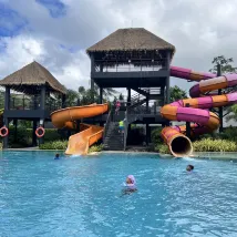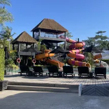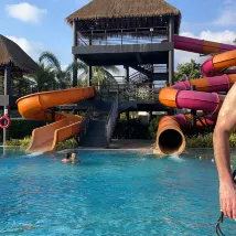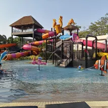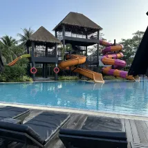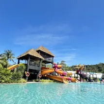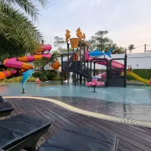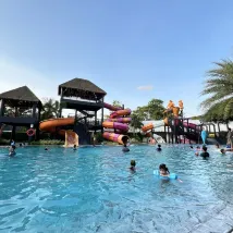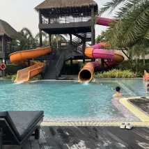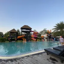 家族連れに最適スライドがたくさんあります。滑り台のあるキッズゾーンが子供は気に入っていますが、行った日はかなり暑かったです。午後 4 時 30 分頃に遊びに来なければなりませんでした。子供用プールには日陰がなく、プールの水はとても暑かったです。乗り物が閉まるのが少し早すぎました。太陽が輝いていました。乗り物は閉まり、子供たちは楽しんでいました。アトラクションは午後 6 時に閉まります。スイミングプールは午後 8 時に閉まります。部屋は広く、エアコンも効いていて涼しいですが、バスルームの設備は少し古く、傷んでいる箇所もありました。朝食はおいしいです。 チキントムカーはおいしいです。 食事のメニューは一般的な朝食の標準です。私が通っていた時代は、テーブルで食べるのに立ち止まるほどの時間がなく、立って待たなければならなかった時代でしたが、それほど時間はかかりませんでした。