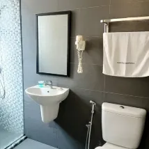 この宿が大好きです!外から見ると少し怪しい感じでしたが、チェックイン後は最高でした。ドアと電気はキーカードで操作しました。バスルームがきちんと整備されているのが気に入りました。シャワーには温水器、ビデ、ヘアドライヤーまでありました。部屋には、仕事中に使える予備の椅子と、クローゼット、そしてセーフティボックスがありました。コンセントも十分にありました。無料のコーヒーのサシェを入れるための飲料水用の温水器もありました。部屋には冷蔵庫までありました!ウォーターフロントに近いですが、近すぎず、徒歩10分ほどなので、立地は良かったです。ホテルのすぐ外に食事のできる場所もありました。