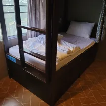 チェックイン時にデポジットとして ฿500 預ける必要があります。 チェックイン後、部屋だけ指定され、部屋の中の空いているベッドの好きなところに行けば良いと言われ少し戸惑いましたが、使い勝手がわかってくると、とても快適でした。各ベッドに電源とUSB、ライトと小棚があり便利です。ただプライバシーは弱めで、上の段のベッドには側面だけカーテンがあり上からは丸見えの状態です。 奥にランドリーと広い洗濯物干し場があり、とても乾きが良いのでこれは助かりました。 地階の奥に小さなバーがあり、小さいグラスですが1杯分の引換券がもらえ、これも嬉しいサービスです。 あと立地がとても良く、ボート乗り場やナイトマーケットも徒歩ですぐです。 川沿いの遊歩道は夕方はウォーキングやジョギングをしている人が多いですが、散歩に良いです。 2泊しましたがトータルでとても満足度が高いです。またクラビタウンに来ることがあれば利用したいホテルです。