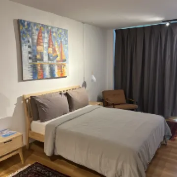 素晴らしいロケーション - ビーチまで 200 m。近くにはナイトマーケットやたくさんのショップ、カフェがあります。 スタイリッシュで清潔な部屋。そして、それほど小さくはありません。 バルコニーに椅子がもう2脚あります。 2階は実際には3階です((