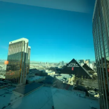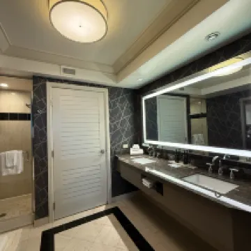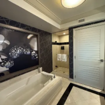 高層階の部屋に2泊しました。部屋からの眺めがとてもよく部屋も清潔で広かったです。バスルームにはバスタブとシャワーが別についていました。部屋の冷蔵庫はミニバーで個人の物は使用できません。また、コーヒーや水、ナッツなども全て有料です。ホテルから出ているトラムやホテル前のバス停で乗れるデュークバスはとても便利です。ラスベガスでの素敵な時間を過ごすことができました。