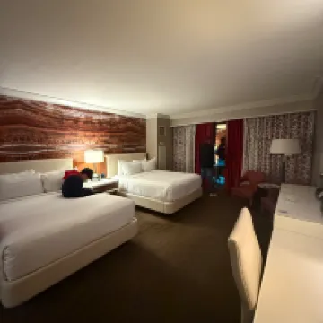 2時ごろにホテルのフロントに行き、 14階はすぐにチェックイン可能性との事でしたが。 しかし夫も息子も高層階希望。 その時は満室らしく高層階は掃除中。 それで28階のお部屋を予約し、 3時間待つ事に。 でも、今度は3時間以上過ぎても、 ホテルよりメッセージ連絡なく。 仕方なくもう一度ホテルのフロントに 長蛇の列に並び、聞くと、 もう8階のお部屋しか空きがないと。 しかし2度目のフロント係の方が日本人! それから色々と手を尽くして頂き、 56階のお部屋を提案して頂き。 とても丁寧な対応!!! はっきり言いまして、 ホテルのお部屋もプールも全て、 パーフェクトです。 しかし、フロントの方の多くが、 沢山の量の業務をこなさないといけないのか とても態度が冷たいです。 マニュアル通りのお仕事。 たぶんAIの方が親切かと。 それなのに仕事が中途半端に感じました。 その中で、日本人のフロントの方は、 素晴らしいお仕事!!! 困った事があれば、アジアの方のフロント係に 行けば、間違いない! あと、フロアに所々いるお掃除の方 とかの方がよっぽど、 フロント係や、 フロントにいる男性(マネージャー?)よりも 小さな困り事(チェックアウトの仕方とか) 笑顔で、すぐに教えてくれますよ✨ 心強いし、時間の無駄にはなりません。 本当にありがたかったです。