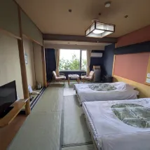 2泊3日で宿泊しました。予約したお部屋は和風タイプのシングルベットが2つあるお部屋でしたが実際は畳の和室でした。チェックイン時に部屋の清掃について聞かれたので連泊だからしなくて大丈夫と伝えてました。夜に布団を敷に来られると聞いていたのですが 来られず、、、仕方なく自分たちで敷くことにしましたがシーツが無かったのでフロントに電話をしたところ 部屋の清掃をしなくて良いと言われたので布団は敷きませんでしたと言われました。???海側のお部屋で景色はとても良いホテルなのに少し残念でした。