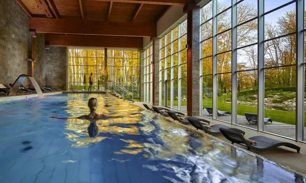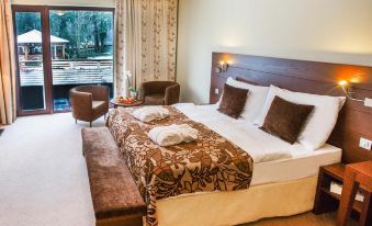 Great hotel set away from the busy towns in the area. 4* with excellent wellness set up, polite staff and a good selection on the restaurant menu. Easy access to the hotel with parking, and we stayed in a wood cabin style room with large veranda which was delightful in fact. Excellent.