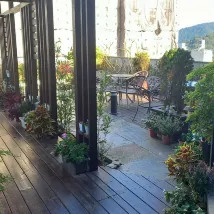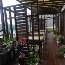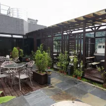 朝食は最上階で、丁寧にデザインされた盆栽やプランのあるテーブルと椅子で提供され、山、川、湖畔の美しい景色を眺めることができます。