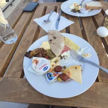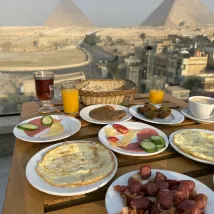 朝食から眺めたピラミッドの眺めは一生忘れられません。*、サラダ、ソーセージ、チーズ、七面鳥、パンなど、ボリュームたっぷりの美味しい朝食でした。到着時には、美味しいフレッシュマンゴージュースもいただきました。テラスからは、午前8時30分からピラミッドのライトショーをお楽しみいただけます。