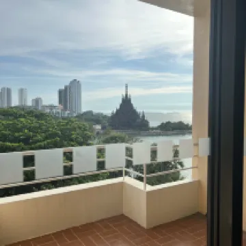 このホテルの唯一の利点は、真実の神殿の眺めです。それ以外は、立地があまり良くなく、ホテルを出ると荒れ地が広がり、インフラ施設に行くのに15分ほど歩く必要があります(ただし、セブンイレブンまでは徒歩5分です)。部屋の明るさは低く、トイレの配管にはカビが生えており、バルコニーには仕切りがないため、隣人の行動が容易に観察できます。そのため、下着姿で歩き回る場合はカーテンを閉める必要があります。さらに、水道が断続的に出ることがあり、温水で体を洗っていると、突然熱湯が出てくることがあります。