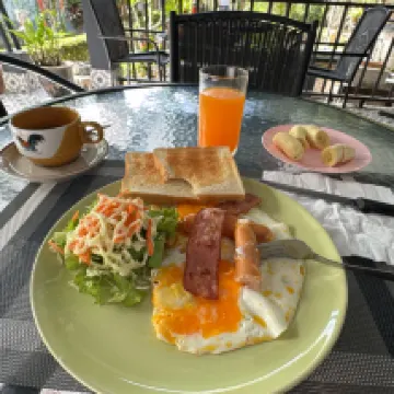 設備: 設備は充実しており、温水シャワーも利用可能。無料のミネラルウォーターも用意されていました。 清潔さ: 清潔感があり、とても居心地の良い空間でした。 環境: 静かなガーデンに囲まれていて、落ち着けます。 サービス: 送迎サービスも完備されており、オーナーご夫妻の対応も非常に親切でした。 朝食: オーナーご夫妻が腕を振るって作ってくださる出来立ての朝食は、一人100バーツと素晴らしいコストパフォーマンスでした。