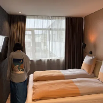 酒店小,佈局不合理,101房間門正對大堂,非常近,隔音差,出入人員聊天清晰能聽到,總共四面牆,兩面是半身玻璃窗,窗外就是停車場,非常近,伸手就能拉開後備箱那種近。而且窗户打不開,房間不通風!進店離店人關後備箱的聲音巨吵,巨吵。沒有熱水壺,沒有mini吧。不值這個價錢。