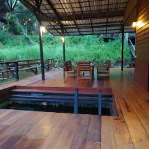 立地は最高です。夜は水の流れる音だけが聞こえます。本物のトロピカルウッドで作られたインテリアは、とてもエレガントです。夕食はボリュームたっぷりで、とてもリーズナブルでした。オーナーはフレンドリーで親切でした。自信を持っておすすめします。