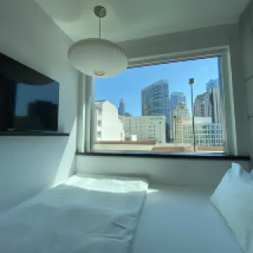 ベッドは快適で、部屋には外窓がありました。清潔でスタイリッシュな雰囲気で、冷蔵庫と飲料水も完備されていました。ご心配な方は、3階のリビングとダイニングエリアで無料の温水と冷水をご利用いただけます。立地はユニオンスクエアに近く便利ですが、夜は少し怖いかもしれません。スタッフは概ね親切でしたが、1階の正面玄関に警備員が常駐していたので安心しました。料金を考えると、宿泊施設の質は許容範囲内で満足できるものでした。