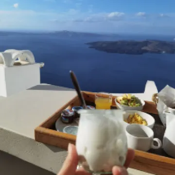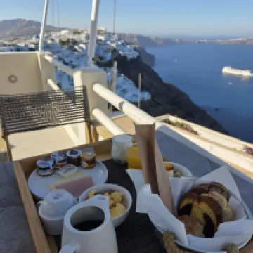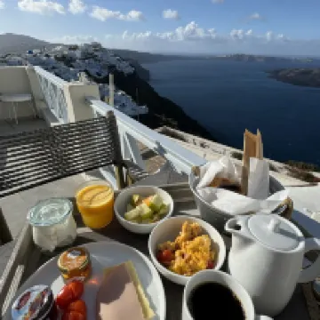 ハネムーン旅行で宿泊しました。場所は中心地のフィラから10分ほど歩く場所に立地していますが、特別遠いとは感じませんでした。ただ、道中アップダウンが激しいので、キャリーケースの持ち運びは大変でした。 朝ごはんはスクランブルエッグに、パンが数種類とヨーグルトといたって、普通でしたが、美味しく頂きました! 朝ご飯を食べる共用スペースからの景色はとても綺麗でおすすめです。こちらのホテルに泊まる醍醐味はここにあると思います。