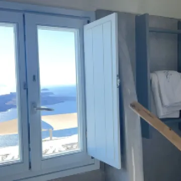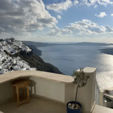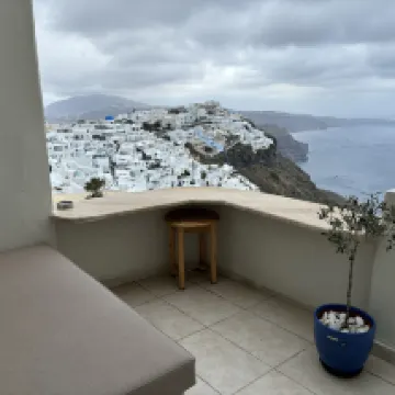 景色は息を呑むほど素晴らしく、お部屋も広々としています!ロマンティックスイートを選べば、バルコニーからフィラの街全体と遠くの火山まで見渡すことができます。フィラでこれ以上の眺めはないでしょう。 バルコニーでフィラの美しい景色を眺めながら朝食をとったことは、サントリーニ島で忘れられない思い出の一つになるでしょう。 フィラの中心部からは少し離れていますが、街からアパートメント近くの駐車場まで車で直接行くことができます。道路からレセプションまでは階段がありますが、親切なスタッフが荷物の運搬をお手伝いします。 敷地内には猫がいて、よく歩き回っていて、お部屋に入ってくることもあります。撫でてもいいですが、噛まれないようにご注意ください。