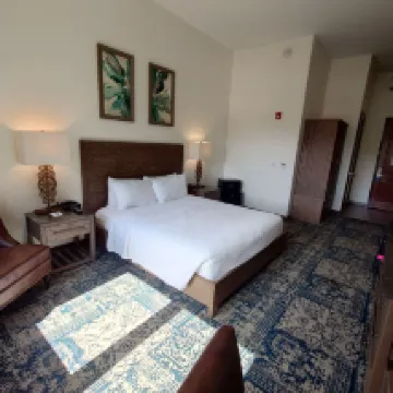 Room was big, but poor use of space and poor lighting. Barn door for bathroom door and it did not fully close. Very little lighting by the bathroom basin. Felt like shaving by candlelight. Needed extra towels, but had to go to the lobby after asking several times. Asked housekeeping to make up the spare bed. Instead, they dropped off some sheets in a plastic bag with no pillows. Food from the prior stay was still in the carpet in the corner of the room. Full bar with very friendly bar staff. Morning coffe was lukewarm.