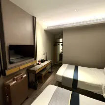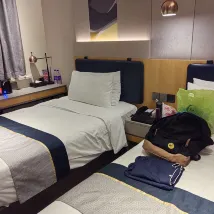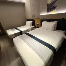 この宿が気に入りました!立地はとても便利で、南京東路駅からわずか300メートルです。1、2、3番出口から出られますが、2番出口を強くお勧めします。上り下りのエスカレーターがあり、恒吉セレブリティショッピングセンターのすぐ内側に出られるので、特に荷物を持っている場合はとても便利です。駅からホテルまで歩くのも快適で、道沿いには地元の飲食店がたくさんあります。天津路と寧波路という2つの小さな通りがあり、そこにはたくさんのレストランがあり、おそらく全部で20軒ほどあります。価格も手頃で、種類も豊富です。 フロントデスクで英語を話せるスタッフは1人だけでした。しかし、皆とても親切でフレンドリーでした。他のスタッフはGoogle翻訳で問題なく翻訳できました。ハウスキーピングチームには特に感謝です。部屋は毎日掃除され、タオルと水の補充も毎日行われ、とても丁寧でした。 私たちは2階建てのメゾネットタイプのファミリールームに宿泊しました。最初に泊まった部屋は窓がなく、少し狭く、荷物を開けるのが大変でした。でも、幸いエアコンが故障していたので、通りに面した窓のある別の部屋に移してもらいました。その部屋はずっと良くて、写真通り、清潔で明るく、3~4人が快適に過ごせる広さでした。エアコンはすごく冷えていて、長い一日の外出の後には最高でした。ベッドと枕はとっても柔らかくて快適でした!最初は少しタバコの臭いがしましたが、1~2日で消えました。遮光カーテンも良かったです。私たちの部屋は通りに面していましたが、夜は騒がしくありませんでした。北京路は驚くほど静かで、特に夜は静かです。 ホテルのすぐ隣に24時間営業のローソンがあり、とても便利でした。また、入り口のすぐ外には、ありとあらゆる色とブランドのシェアサイクルがたくさん停まっていて、移動も簡単でした。バス停も近く、正面玄関からすぐに滴滴出行のタクシーに乗ることができます。