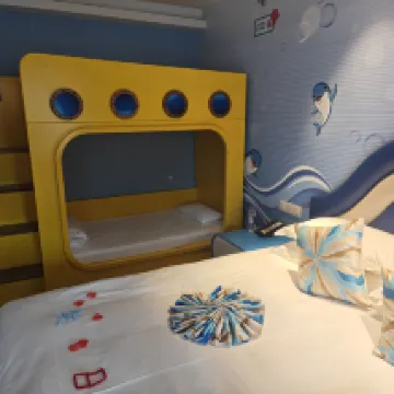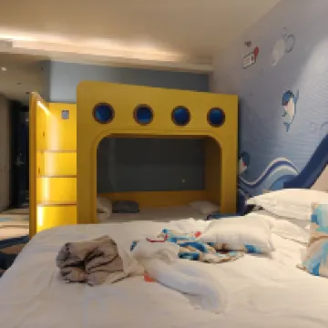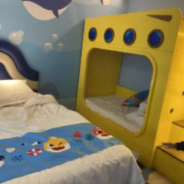 お部屋はとても可愛くて二段ベッドに子供たちが大喜びでした。 15時チェックインでしたが、14時頃にはお部屋に入れました。 上海海晶海洋公園のすぐ近くで、2日分のチケットがセットになっており、2日間たっぷり楽しめました。 英語が通じるスタッフさんがいてとても助かりました。 12時頃にロビーにキャラクターがいて、キャラクターがくる時間が事前にわかれば子供たちに見せてあげれたのにと少し残念でした。 子供たちはとてもお気に入りのホテルになったので、また泊まりに来たいです。