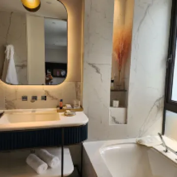 国慶節の休暇中に、子供がホテルに泊まりたがったので、ホテルで一番広くて一番高いブラックストーンテラススイートを予約しました。ホテルには専用駐車場がなく、不便でした。朝食の種類が非常に少なく、ビュッフェには2、3種類のフルーツ、牛乳、オレンジジュース、スライスパン、コーンと野菜の包子しかなく、アラカルトでセットメニューを注文する必要がありました。セットメニューの小籠包がまさかの冷凍食品で、この価格帯のホテルで冷凍食品を使うのは少しやりすぎではないでしょうか。部屋のシャワーのお湯も不安定で、突然熱くなったり冷たくなったりして、何度か火傷しそうになりました。子供の頭や体を洗うのが怖くて、慌てて簡単にシャワーを浴びさせるだけでした。宿泊体験は最悪で、二度と利用しません!