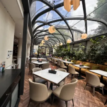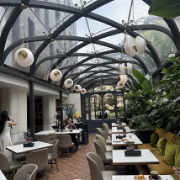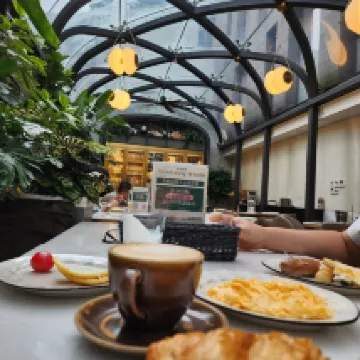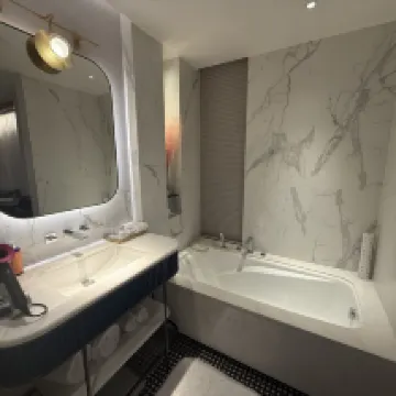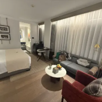 立地は地下鉄から少し離れており、初めてだと見つけにくいかもしれません。良い点としては、内装がとてもおしゃれで、併設されているレストラン、バー、カフェ、書店がすぐ近くにあり、ルームキーを提示すると割引が受けられることです。しかし、チェックイン体験は今ひとつでした。到着時間を事前に伝えていたにもかかわらず、部屋の準備ができるまで30分も待たされました。また、部屋のトイレが本当に小さく、少し体格の良い方だと使いにくいのではないかと心配になりました。さらに、朝食ビュッフェの選択肢が非常に少なく、ソーセージ以外に肉類は見当たらず、アラカルトメニューも炭水化物中心で、定番のエッグベネディクトすらなかったのには驚きました。他の細かい点では、悪くありませんでした。チェックイン当日に誕生日であることを伝えていたため、夜部屋に戻るとバースデーケーキとメッセージカードが置かれていました。