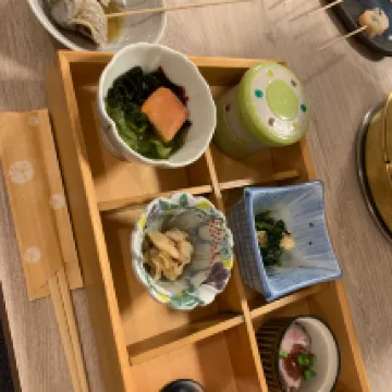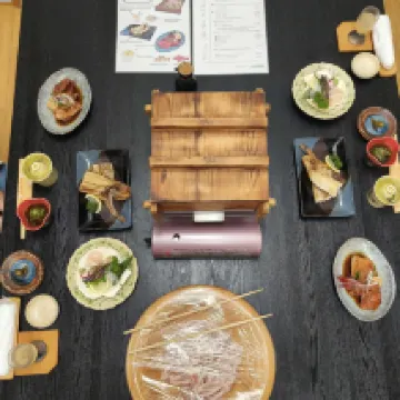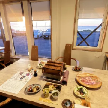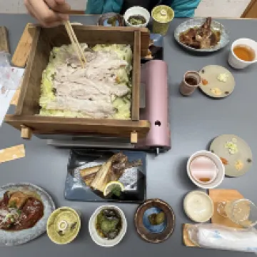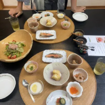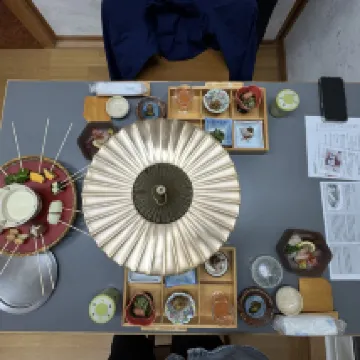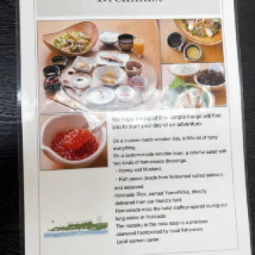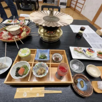 一泊二食,從景色、餐食、服務、房間都很棒!停車免費、停在店門口有機會會想在來,民宿的主人小姐姐英文很好,民宿的爺爺奶奶一起接待旅客。飯店內有泡湯也有戶外池,很有氛圍、房間內也很舒適,餐食很有趣、是自己炸天婦羅、準備的早餐、晚餐都很棒。 景色更不用說,人生景點、夕陽、流冰、岩石。