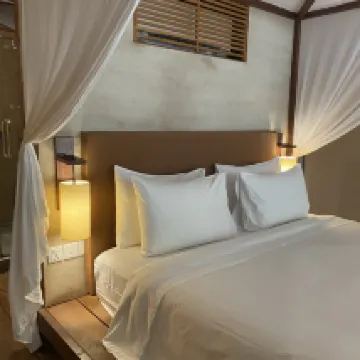 プライバシーもとても良く環境も綺麗ですが、蚊が多いので気にする人は慎重に選んだ方が良いと思います。 2ベッドルームヴィラはとても広く、マスターベッドルームのバスルームはフルオープンなので、雨季には暑く感じるかもしれません。屋外プールでは浄水用の薬品を多量に使用しているため、肌の敏感な方は遊泳時にご注意ください。
