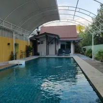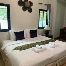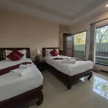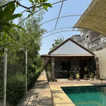 The hotel is small, and somewhat hidden on a narrow street behind a 7-11 in new Sukhothai. Google maps got us there easily. I had to call the displayed phone number to get someone to open the locked entrance door. Once inside, all was well and they gave us a room key plus an electronic key to access the door to the street. The room we got was clean and cheery and there was a hot water maker and refrigerator. Our 5-year old enjoyed the pool with me but the water is too deep for small children to be in safely without an adult. Breakfast was good and they made a very tasty coffee.